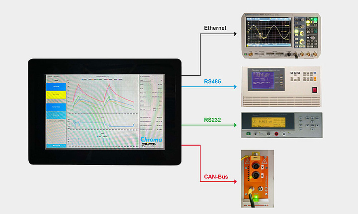 Die Kommunikation zwischen PC und Komponenten erfolgt über gängige industrielle Schnittstellen wie Ethernet, CAN-Bus, RS232 und RS485. Damit bietet die Prüfkabine maximale Flexibilität und ist zugleich zukunftssicher ausgelegt.